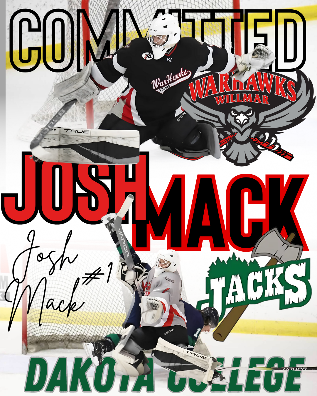 “Extremely happy for Josh Mack’s next hockey chapter at Dakota College at Bottineau” Head Coach and GM Payton Ruter said. “He represented the WarHawks for 2 years and was one of the best. A quiet, hard worker that plays with passion between the pipes.”