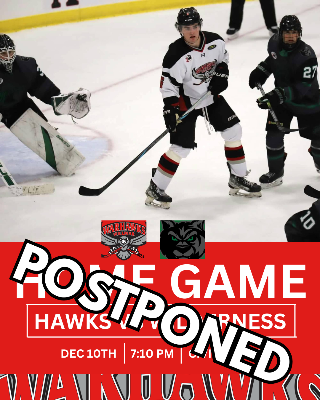 Tonight’s game against the Minnesota Wilderness on December 10th has been postponed due to weather conditions up north and for the safety of the away team. We have been in constant contact with the Wilderness coaching staff and the decision was made by the Wilderness organization that the conditions of the roads were not worth the risk of making the 5 plus hour trip down to Willmar. All tickets purchased will be honored when the date is rescheduled. We appreciate our fans for understanding and are in full support of this decision. The safety of all players and staff of the NA3HL are all of our top priorities.